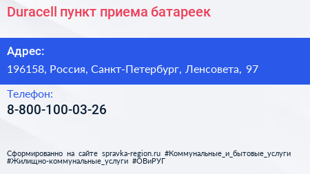 Duracell, пункт приема батареек по адресу 196158, Россия, Санкт-Петербург, Ленсовета, 97 в дальнейшем Организация, размещена в следующих категориях: