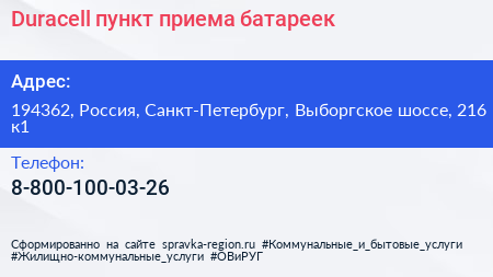 Duracell, пункт приема батареек по адресу 194362, Россия, Санкт-Петербург, Выборгское шоссе, 216 к1 в дальнейшем Организация, размещена в следующих категориях: