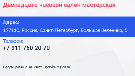 Двенадцать, часовой салон-мастерская по адресу 197110, Россия, Санкт-Петербург, Большая Зеленина, 5 в дальнейшем Организация, размещена в следующих категориях: