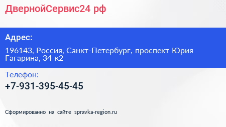 ДвернойСервис24.рф по адресу 196143, Россия, Санкт-Петербург, проспект Юрия Гагарина, 34 к2 в дальнейшем Организация, размещена в следующих категориях: