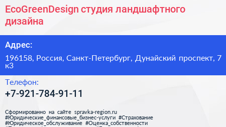 EcoGreenDesign, студия ландшафтного дизайна по адресу 196158, Россия, Санкт-Петербург, Дунайский проспект, 7 к3 в дальнейшем Организация, размещена в следующих категориях: