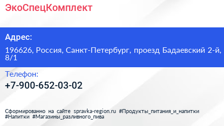 ЭкоСпецКомплект по адресу 196626, Россия, Санкт-Петербург, проезд Бадаевский 2-й, 8/1 в дальнейшем Организация, размещена в следующих категориях: