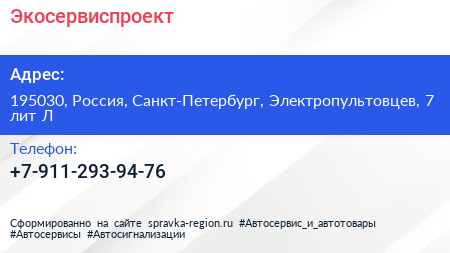 Экосервиспроект по адресу 195030, Россия, Санкт-Петербург, Электропультовцев, 7 лит Л в дальнейшем Организация, размещена в следующих категориях: