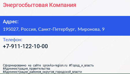 Энергосбытовая Компания по адресу 195027, Россия, Санкт-Петербург, Миронова, 9 в дальнейшем Организация, размещена в следующих категориях: