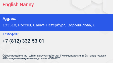 English Nanny по адресу 193318, Россия, Санкт-Петербург, Ворошилова, 6 в дальнейшем Организация, размещена в следующих категориях: