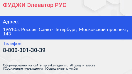 ФУДЖИ Элеватор РУС по адресу 196105, Россия, Санкт-Петербург, Московский проспект, 143 в дальнейшем Организация, размещена в следующих категориях: