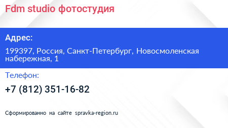 Fdm studio, фотостудия по адресу 199397, Россия, Санкт-Петербург, Новосмоленская набережная, 1 в дальнейшем Организация, размещена в следующих категориях: