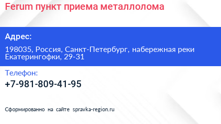 Ferum, пункт приема металлолома по адресу 198035, Россия, Санкт-Петербург, набережная реки Екатерингофки, 29-31 в дальнейшем Организация, размещена в следующих категориях: