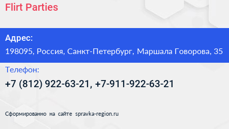 Flirt-Parties по адресу 198095, Россия, Санкт-Петербург, Маршала Говорова, 35 в дальнейшем Организация, размещена в следующих категориях: