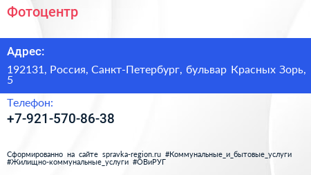 Фотоцентр по адресу 192131, Россия, Санкт-Петербург, бульвар Красных Зорь, 5 в дальнейшем Организация, размещена в следующих категориях: