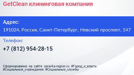 GetClean, клининговая компания по адресу 191024, Россия, Санкт-Петербург, Невский проспект, 147 в дальнейшем Организация, размещена в следующих категориях: