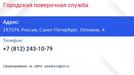 Городская поверочная служба по адресу 197374, Россия, Санкт-Петербург, Оптиков, 4 в дальнейшем Организация, размещена в следующих категориях: