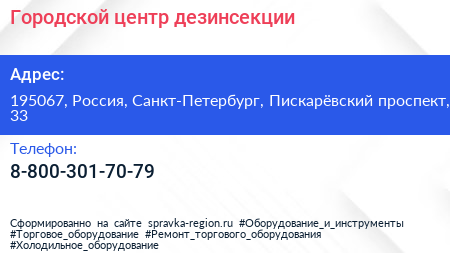 Городской центр дезинсекции по адресу 195067, Россия, Санкт-Петербург, Пискарёвский проспект, 33 в дальнейшем Организация, размещена в следующих категориях: