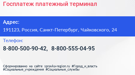 Госплатеж, платежный терминал по адресу 191123, Россия, Санкт-Петербург, Чайковского, 24 в дальнейшем Организация, размещена в следующих категориях:
