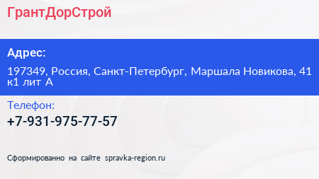 ГрантДорСтрой по адресу 197349, Россия, Санкт-Петербург, Маршала Новикова, 41 к1 лит А в дальнейшем Организация, размещена в следующих категориях:
