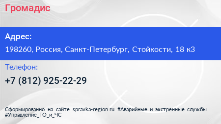 Громадис по адресу 198260, Россия, Санкт-Петербург, Стойкости, 18 к3 в дальнейшем Организация, размещена в следующих категориях:
