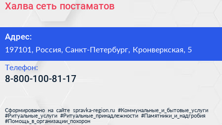 Халва, сеть постаматов по адресу 197101, Россия, Санкт-Петербург, Кронверкская, 5 в дальнейшем Организация, размещена в следующих категориях: