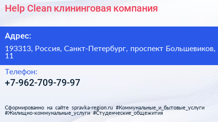 Help Clean, клининговая компания по адресу 193313, Россия, Санкт-Петербург, проспект Большевиков, 11 в дальнейшем Организация, размещена в следующих категориях: