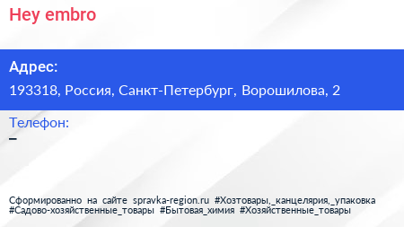 Hey embro по адресу 193318, Россия, Санкт-Петербург, Ворошилова, 2 в дальнейшем Организация, размещена в следующих категориях: