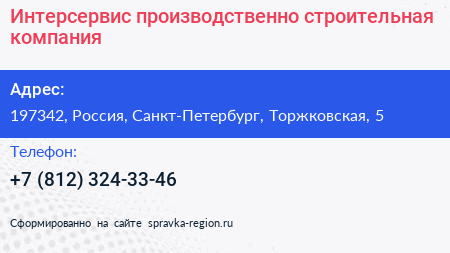 Интерсервис, производственно-строительная компания по адресу 197342, Россия, Санкт-Петербург, Торжковская, 5 в дальнейшем Организация, размещена в следующих категориях: