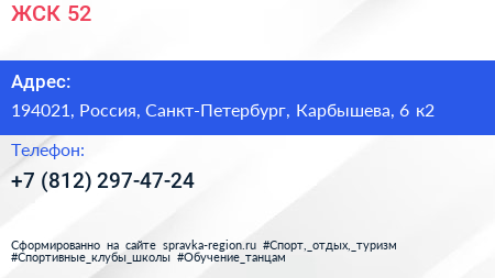 ЖСК №52 по адресу 194021, Россия, Санкт-Петербург, Карбышева, 6 к2 в дальнейшем Организация, размещена в следующих категориях: