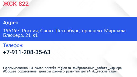 ЖСК 822 по адресу 195197, Россия, Санкт-Петербург, проспект Маршала Блюхера, 21 к1 в дальнейшем Организация, размещена в следующих категориях: