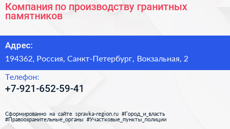 Компания по производству гранитных памятников по адресу 194362, Россия, Санкт-Петербург, Вокзальная, 2 в дальнейшем Организация, размещена в следующих категориях: