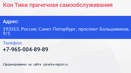 Кон-Тики, прачечная самообслуживания по адресу 193313, Россия, Санкт-Петербург, проспект Большевиков, 9/1 в дальнейшем Организация, размещена в следующих категориях: