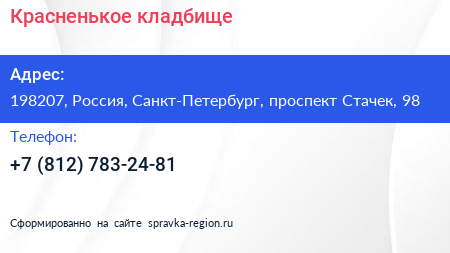 Красненькое кладбище по адресу 198207, Россия, Санкт-Петербург, проспект Стачек, 98 в дальнейшем Организация, размещена в следующих категориях: