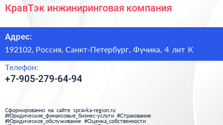 КравТэк, инжиниринговая компания по адресу 192102, Россия, Санкт-Петербург, Фучика, 4 лит К в дальнейшем Организация, размещена в следующих категориях: