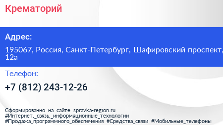 Крематорий по адресу 195067, Россия, Санкт-Петербург, Шафировский проспект, 12а в дальнейшем Организация, размещена в следующих категориях: