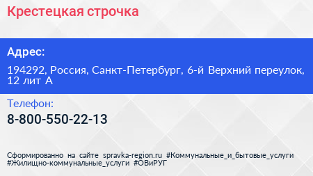 Крестецкая строчка по адресу 194292, Россия, Санкт-Петербург, 6-й Верхний переулок, 12 лит А в дальнейшем Организация, размещена в следующих категориях: