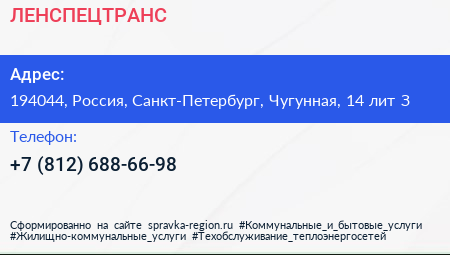 ЛЕНСПЕЦТРАНС по адресу 194044, Россия, Санкт-Петербург, Чугунная, 14 лит З в дальнейшем Организация, размещена в следующих категориях: