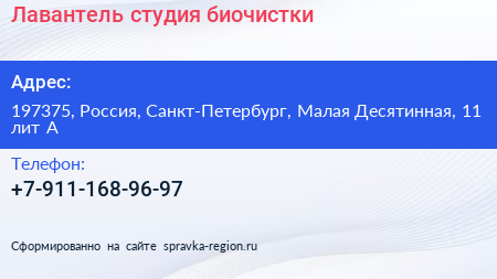 Лавантель, студия биочистки по адресу 197375, Россия, Санкт-Петербург, Малая Десятинная, 11 лит А в дальнейшем Организация, размещена в следующих категориях: