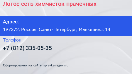Лотос, сеть химчисток-прачечных по адресу 197372, Россия, Санкт-Петербург, Ильюшина, 14 в дальнейшем Организация, размещена в следующих категориях: