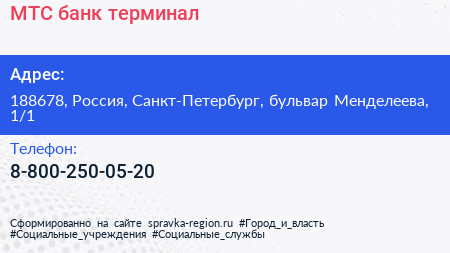 МТС банк, терминал по адресу 188678, Россия, Санкт-Петербург, бульвар Менделеева, 1/1 в дальнейшем Организация, размещена в следующих категориях: