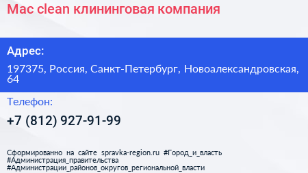 Mac clean, клининговая компания по адресу 197375, Россия, Санкт-Петербург, Новоалександровская, 64 в дальнейшем Организация, размещена в следующих категориях: