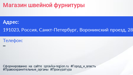 Магазин швейной фурнитуры по адресу 191023, Россия, Санкт-Петербург, Воронинский проезд, 28 в дальнейшем Организация, размещена в следующих категориях: