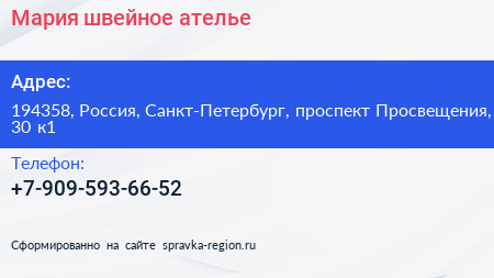 Мария, швейное ателье по адресу 194358, Россия, Санкт-Петербург, проспект Просвещения, 30 к1 в дальнейшем Организация, размещена в следующих категориях: