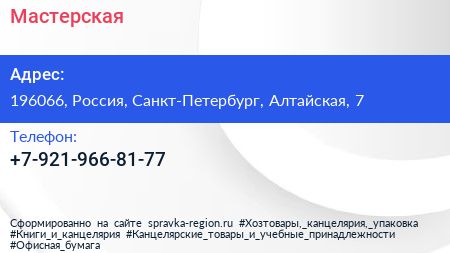 Мастерская по адресу 196066, Россия, Санкт-Петербург, Алтайская, 7 в дальнейшем Организация, размещена в следующих категориях: