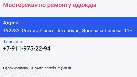 Мастерская по ремонту одежды по адресу 192283, Россия, Санкт-Петербург, Ярослава Гашека, 11Б в дальнейшем Организация, размещена в следующих категориях: