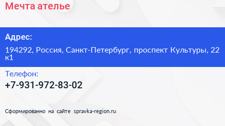 Мечта, ателье по адресу 194292, Россия, Санкт-Петербург, проспект Культуры, 22 к1 в дальнейшем Организация, размещена в следующих категориях: