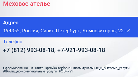 Меховое ателье по адресу 194355, Россия, Санкт-Петербург, Композиторов, 22 к4 в дальнейшем Организация, размещена в следующих категориях: