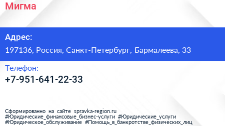 Мигма по адресу 197136, Россия, Санкт-Петербург, Бармалеева, 33 в дальнейшем Организация, размещена в следующих категориях: