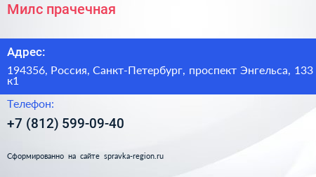 Милс, прачечная по адресу 194356, Россия, Санкт-Петербург, проспект Энгельса, 133 к1 в дальнейшем Организация, размещена в следующих категориях: