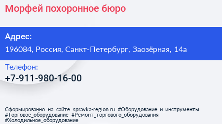 Морфей, похоронное бюро по адресу 196084, Россия, Санкт-Петербург, Заозёрная, 14а в дальнейшем Организация, размещена в следующих категориях: