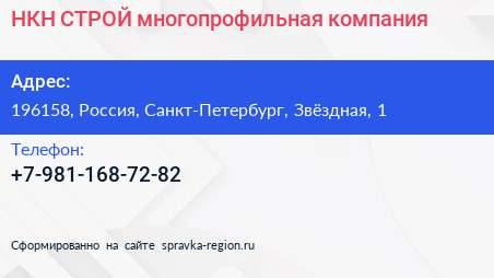 НКН СТРОЙ, многопрофильная компания по адресу 196158, Россия, Санкт-Петербург, Звёздная, 1 в дальнейшем Организация, размещена в следующих категориях: