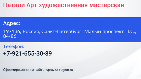 Натали Арт, художественная мастерская по адресу 197136, Россия, Санкт-Петербург, Малый проспект П.С., 84-86 в дальнейшем Организация, размещена в следующих категориях: