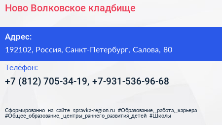 Ново-Волковское кладбище по адресу 192102, Россия, Санкт-Петербург, Салова, 80 в дальнейшем Организация, размещена в следующих категориях:
