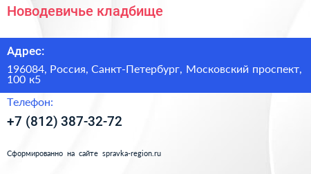 Новодевичье кладбище по адресу 196084, Россия, Санкт-Петербург, Московский проспект, 100 к5 в дальнейшем Организация, размещена в следующих категориях:
